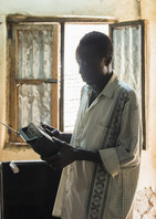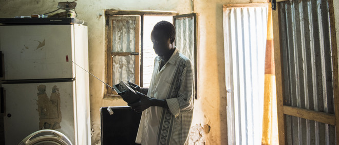 Youwill Dominic listens the news, sports, and music on Eye Radio. Juba, South Sudan. Photo by Charles Lomodong for De Correspondent